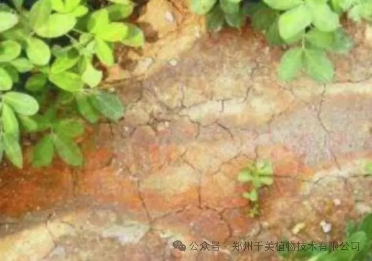 地面湿度大的时候会看到一块块红色的胶状物,等到土壤干了之后,就会出现一片片类似红砖面儿一样的东西,即“红霜”。这个时候就会造成叶片萎蔫等负面影响,就会发生土传病害,影响作物产量。