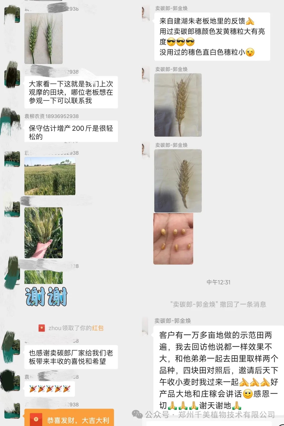 秘密就在于卖碳郎精准营养组合的独特配方。它根据小麦不同生长阶段的需求,科学搭配氮、磷、钾、钙、镁、硫、铜、铁、锰、锌、硼、钼、低聚糖诱抗剂、有机生物活性物质,为小麦提供充足而均衡的营养。这不仅促进了小麦的健康生长,还极大地提高了产量。